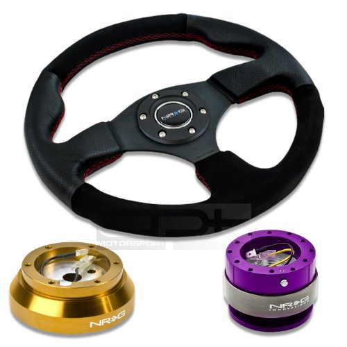 NRG-SRK-140H-RG+012R-S+200PP, NRG Innovations 12.5" 320mm Black Leather Red Stitch Suede Grip Racing Steering Wheel Combo with 6 Hole Short Hub Adapter with Gen 2.0 Purple Quick Release Kit SRK-140H